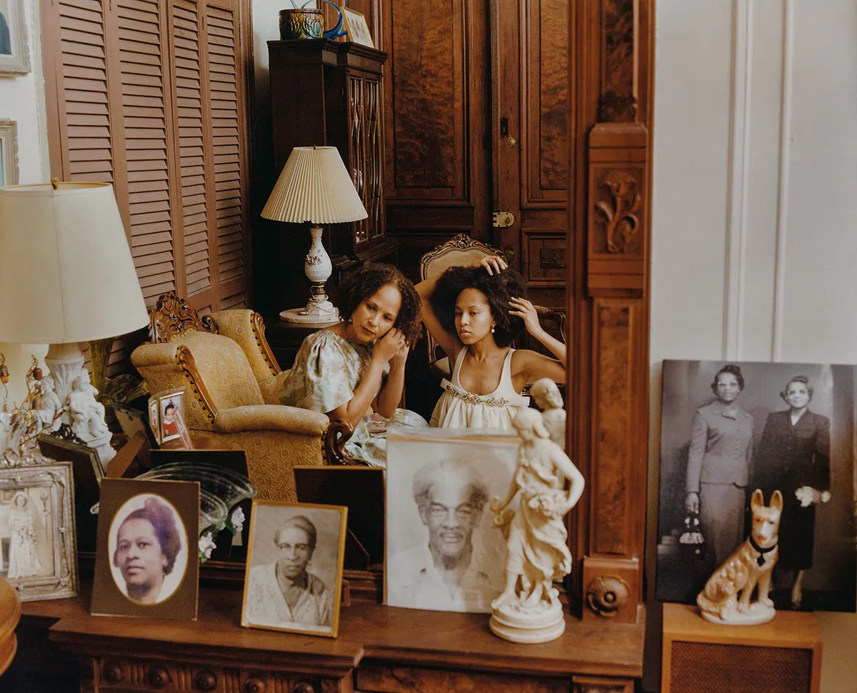 Central to Mitchell’s practice is his painterly command of color. Saturated yet soft, his palettes feel less like documentation and more like atmosphere, hues that breathe, that wrap themselves around his subjects with an almost tactile warmth. These chromatic choices are never arbitrary; they suggest a broad lineage of visual references, from the utopian sensibilities of early American color photography to the iconography of Black Southern vernacular culture, Caribbean portrait studios, and the cinematic poise reminiscent of directors such as Julie Dash. Yet Mitchell’s visual language remains distinctly his own.