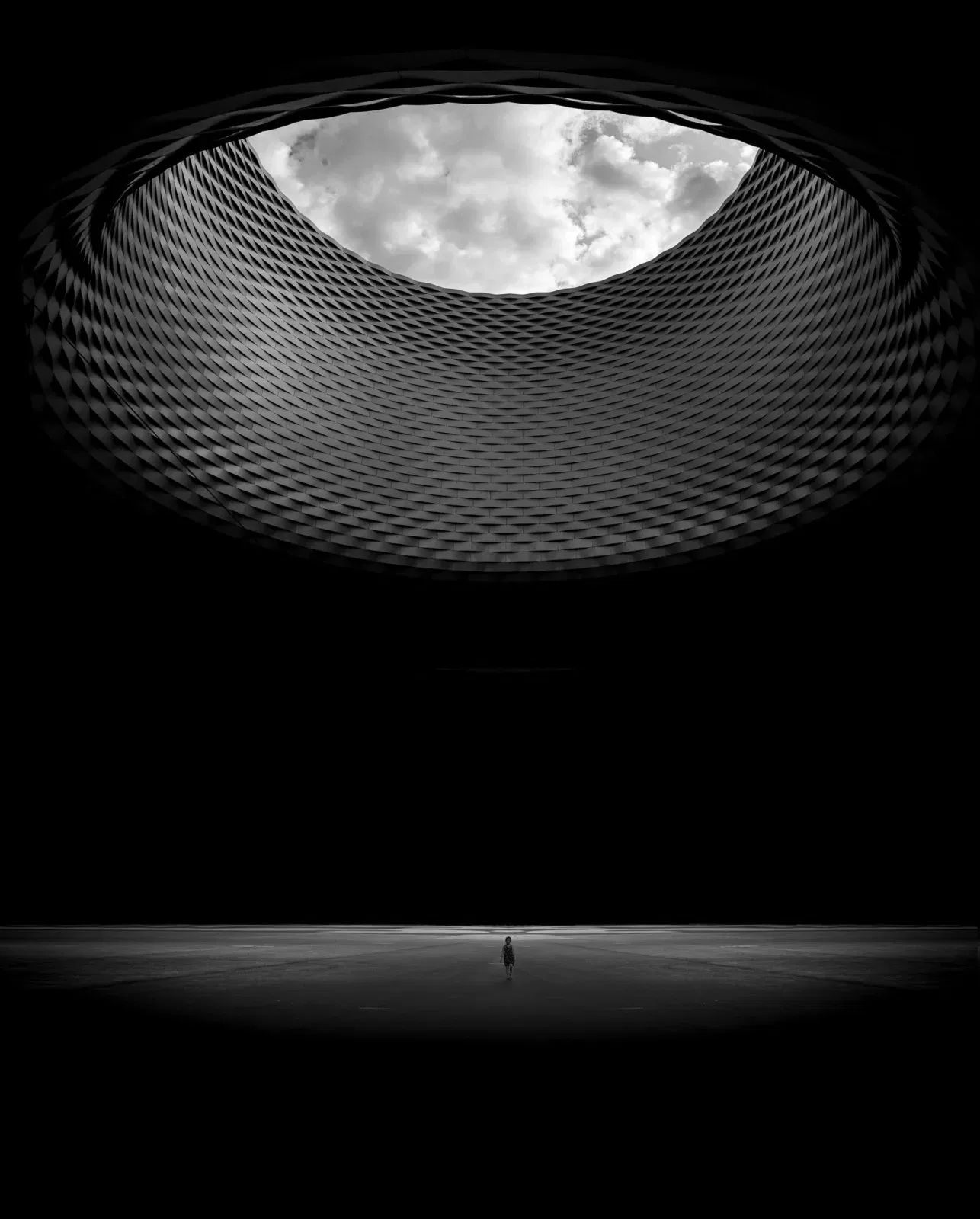 Despite the precision of his compositions, his process is instinctive. He shoots with whatever is in his hands—phones, drones, whatever he is carrying—driven by an immediate pull toward a structure, a beam of light, a scene he cannot walk away from. “I go into a mode where I can’t move or think about anything else until I shoot it,” he explains. One camera does remain constant, however: the Leica Q2 Monochrom, a tool he carries everywhere.
