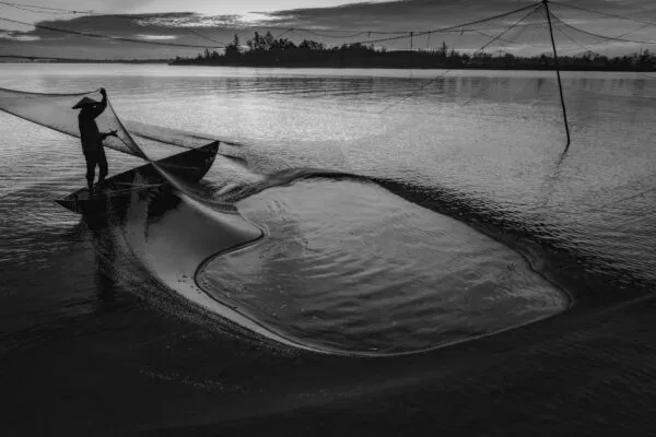 “A Harvest of love in a fishing net, displaying harmony between man and his environment. Fluidity, softness, balance, every detail transforms this everyday scene into a poem filled with serenity, touching and transforming those looking at it”—Pierrot Men