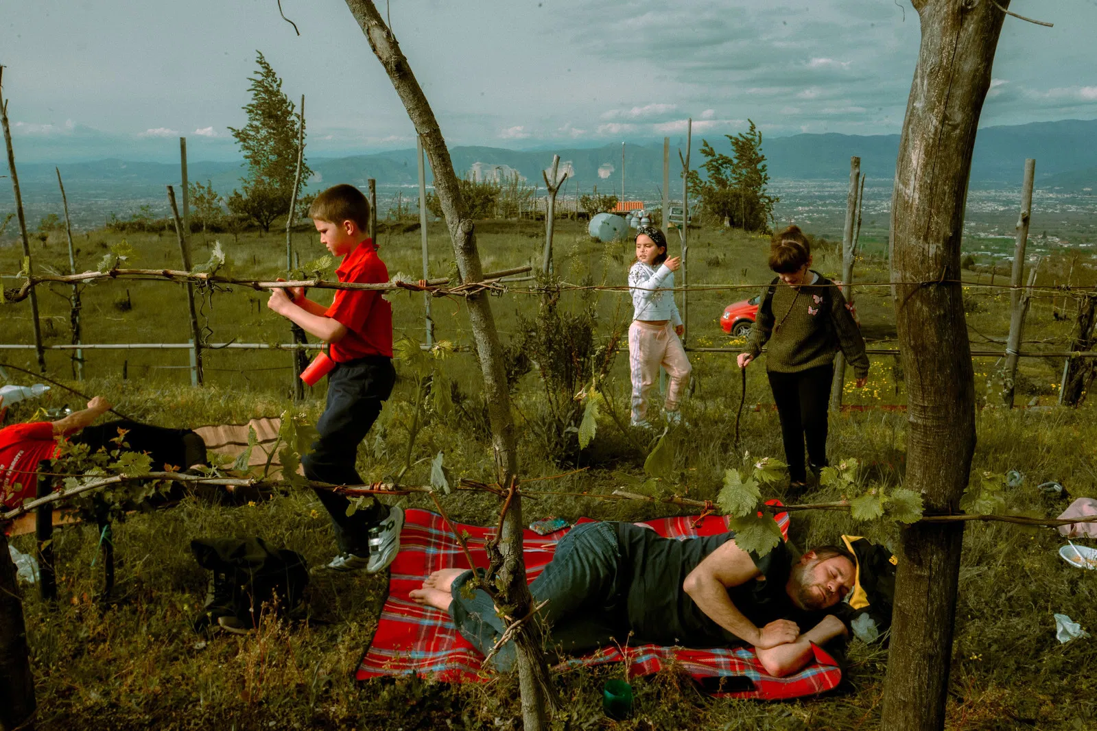 “The visual impact of this image stands exactly opposite from what it describes. Although it appears realistic at first glance, if you observe it more closely, taking into consideration additional parameters, ie color or light, it uncovers a path that leads somewhere beyond the reality it describes. In this case, the emerging reds set a recurrent theme, while the seemingly peaceful family rest is disrupted by the disjointed gazes – all pairs of eyes look in different directions.”— Nikos Economopoulos
