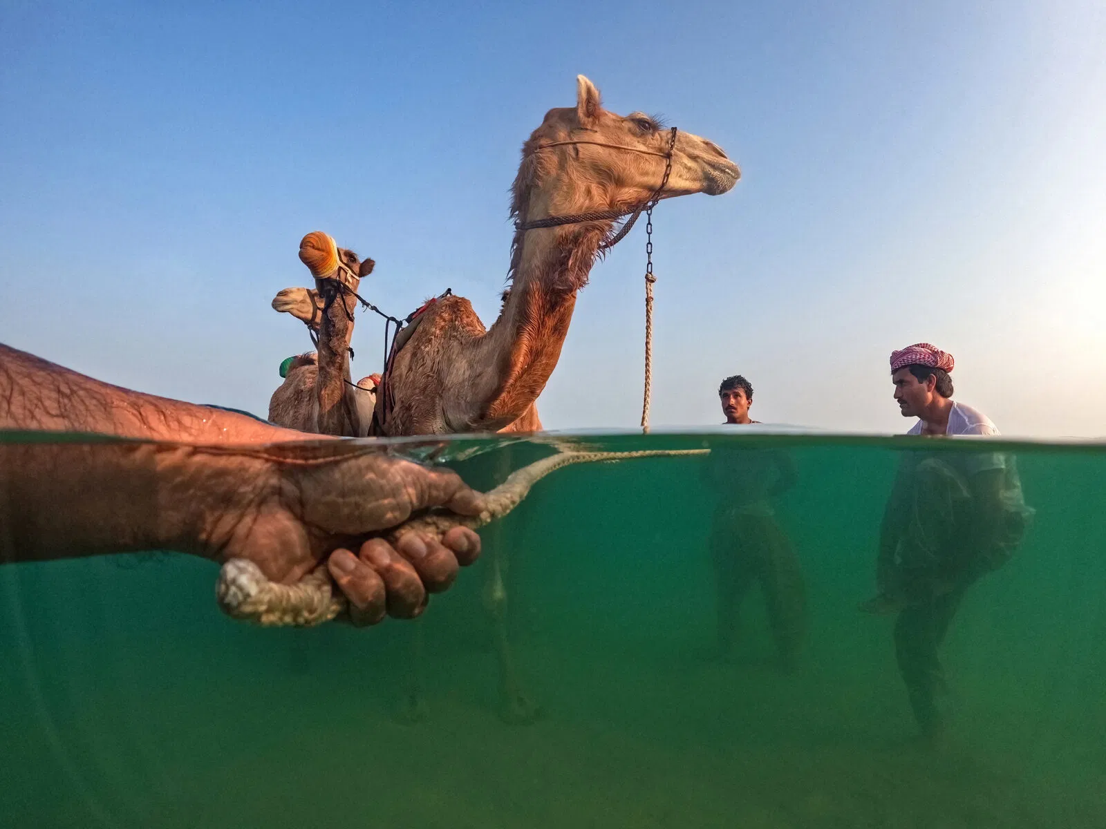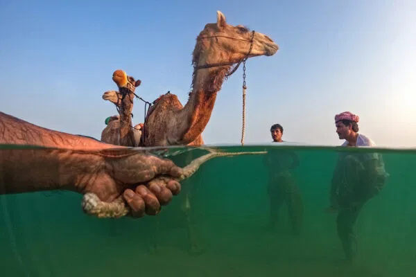 “A stunning image that could well grace the cover of National Geographic. The creative framing, with the camel herder’s hand anchoring from the left, adds depth and perspective and immerses the viewer in the scene. The rich hues, from the bottle-green water to the blue sky, the orange camel muzzle, and the subtle red headscarf, showcase a keen eye for light and color, engendering a painterly quality. It is both a powerful piece of storytelling that immortalizes a fading tradition and a captivating piece of art that encapsulates the essence of travel.“ – The Independent Photographer Editors