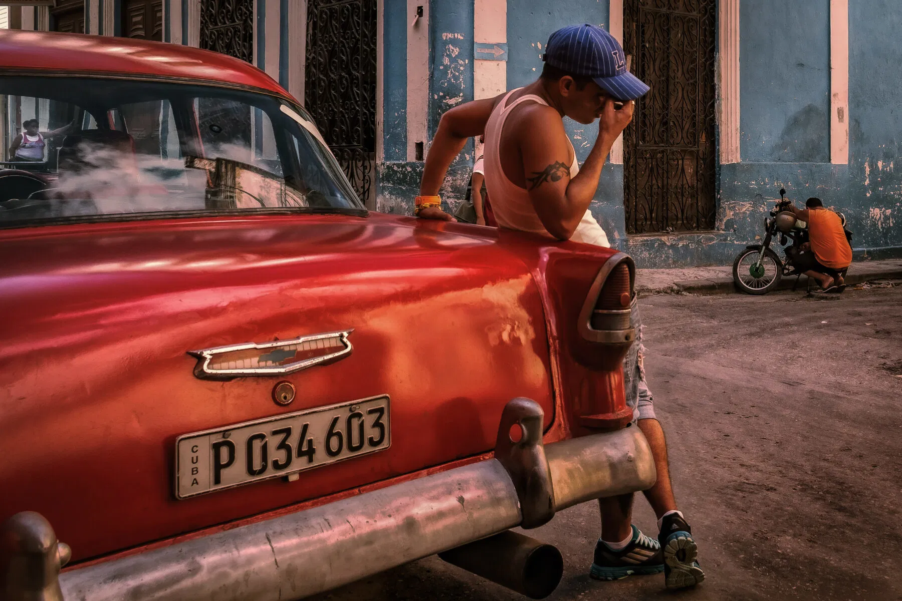 “Andreas Bauer has captured something candid and arresting that transcends cliche-ridden portrayals of the Cuban capital. The choice of framing, achieved in part by the low-angled viewpoint; the combination of textures and vivid colors: it is an image that grows increasingly intriguing with each moment, revealing subtle, and potentially, instructive details. The weary driver resting against his car; the crouched man attending to his motorcycle; the woman on the left (barely discernible at first glance) leaning against the crumbling colonial facade: all three subjects seemingly frozen in time, a metaphor perhaps for the country as a whole. “ – The Independent Photographer Editors