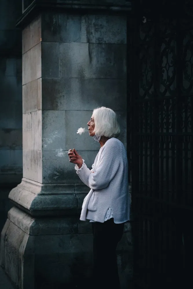 “This smoking lady was pictured in London in 2020, an old country particularly hit by the pandemic and facing new challenges. The lightness of the cigarette’s smoke cloud is balanced by the depth of the look and the thoughts of the woman. The palette of murky and bright colors adds up to the intensity of the dramatic scene.” — Carol Körting