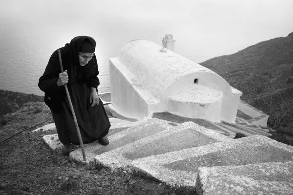 An elderly woman walks stairs up from her local church in Karpathos, Greece © Giorgos Tantsis