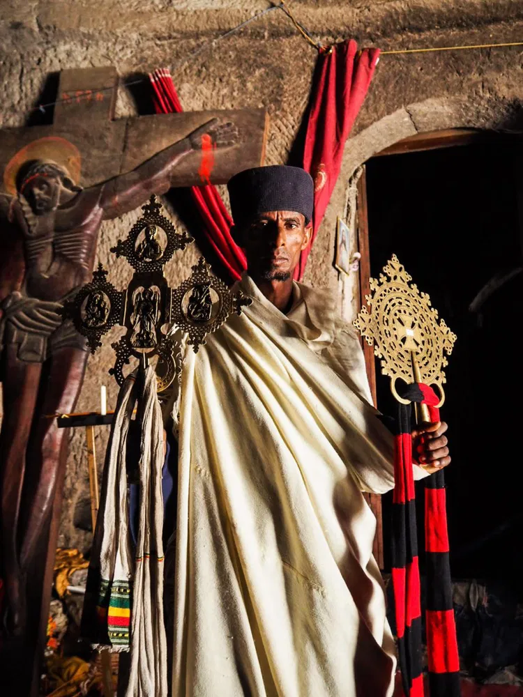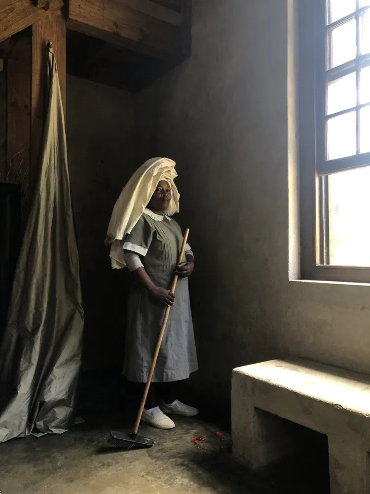 “The photographer shows an awareness of the history of portrait painting in this image that references Flemish Masters such as Vermeer. The natural light pouring from the window highlights the white fabric on the woman’s head and the long sheet draped behind, creating a subtle contrast with the shaded area where the black servant is standing. It’s a domestic scene but she is posing with pride. And the red flowers at her feet, a disturbing detail, add narrative to this well-structured composition. Moreover, there is an interesting historical and pictorial dialectic between the Dutch School and the South African subject of the photograph.” – Magdalena Herrera