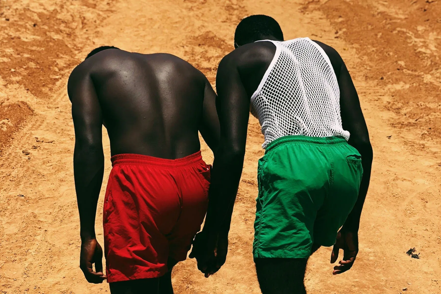 “This photo has elements of suspense which leads me to ask questions such as “what are these men doing?” and “where are they going?”. The intrigue is further exaggerated by the striking colors and the proximity of the men’s hands, as though they were holding one another. The photographer’s choice to shoot in portrait format, with nothing but the yellow-brown of the ground as a background, helps the colors of their shorts really pop out, retaining an abstract feel.” – Sanja Marusic