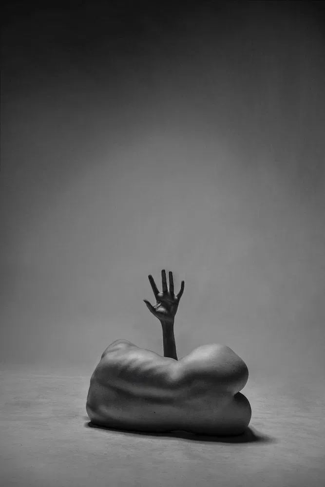 “Like an abstract sculpture bathed in soft light, the body presented in this image gives us the same feeling of curiosity one feels when entering a museum. Blurring the lines between fine art, portraiture and fashion photography it is also unclear what this form represents, perhaps conveying a message of suffering or pain, but likewise hinting towards redemption and afterlife. Ultimately the conceptual composition reminds us that the body is a complex vehicle for all kinds of emotions and messages, narrated succinctly through the masterful use of a limited monochrome palette.” – The Independent Photographer Editors