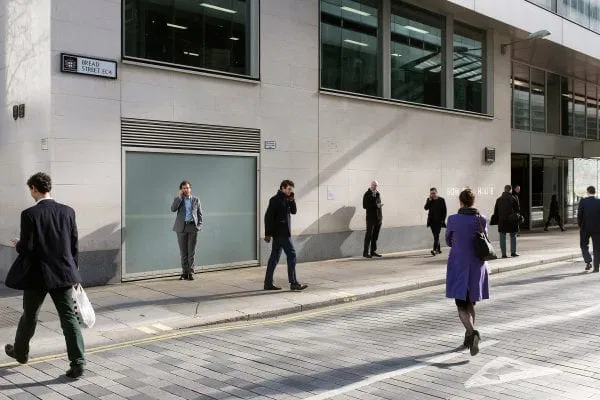 “An instant reminder of Henri Cartier-Bresson’s “Decisive Moment”, this photograph is executed like a perfectly timed theater play with each person perfectly placed in their own position within the frame. These individuals do not observe their environment, but are somehow connected nonetheless, their alignment proving the disconnectedness of modern life and the alienation felt within urban environments.” – REZA