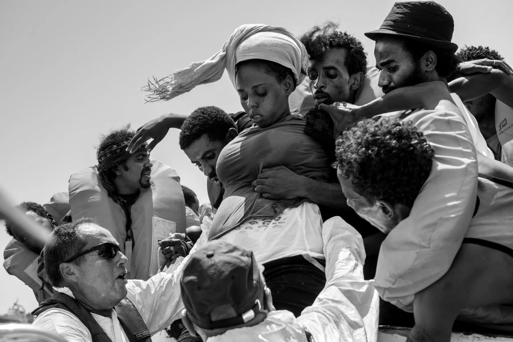 In this photograph I see a strong content related to spot news, that acquires even more power and deeper levels of reading through the use of black and white. The photographer has been able to transform a single action into something that not only reaches a more collective meaning but also produces an impression that can grasp the intimacy of the viewer. For me this photograph brings the tension and the energy of the “Le Radeau de la Méduse” painting into the narration of a modern tragedy.”
