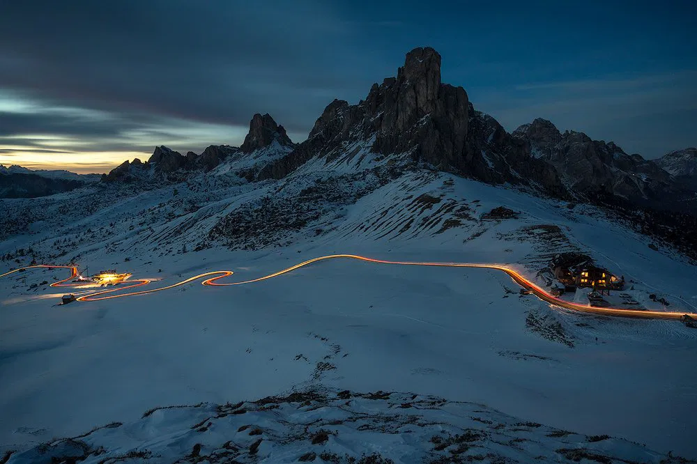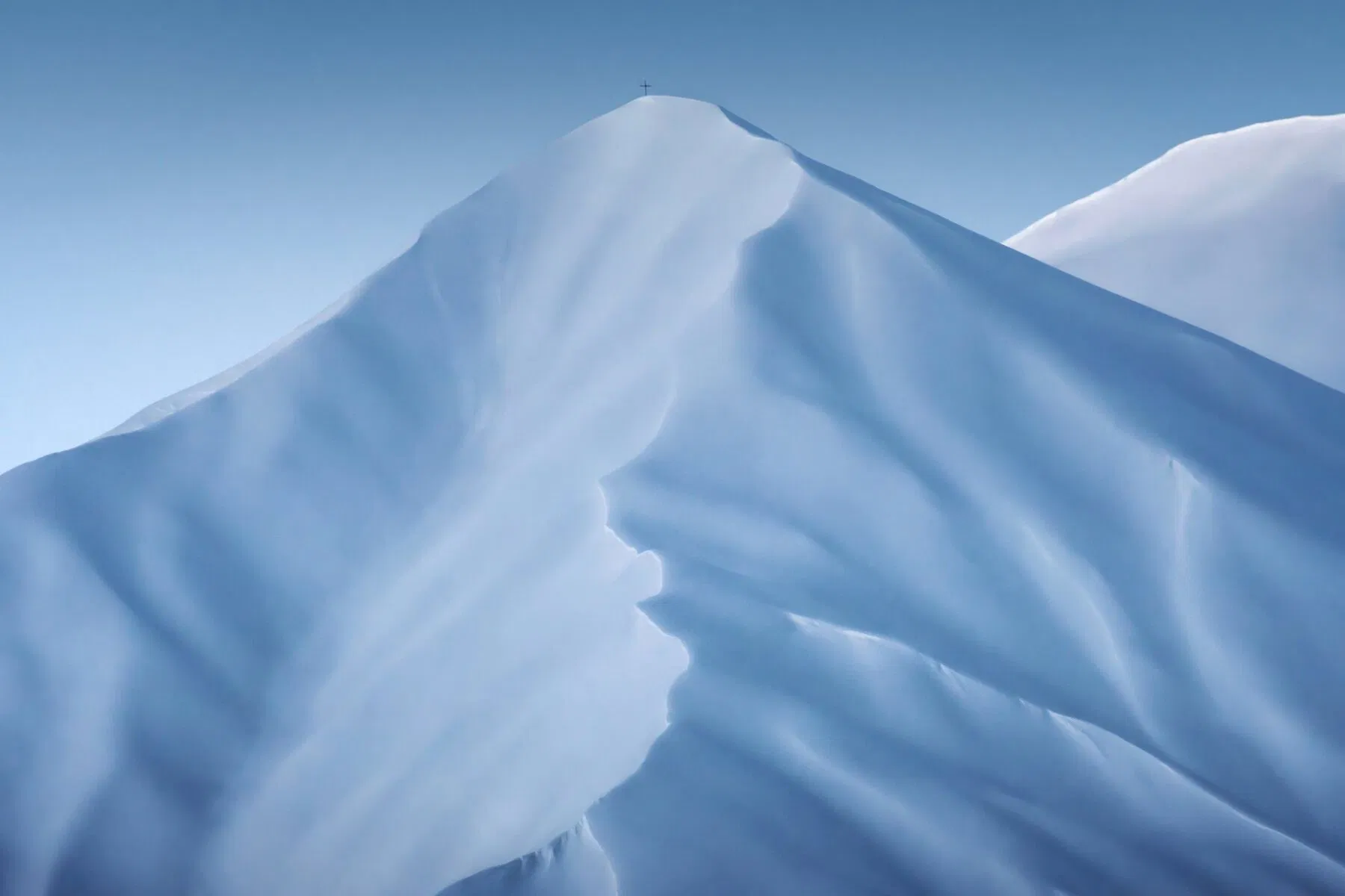 “The air might be frigid but I feel a sense of calm in the frozen folds of blue and white, draped gently over the rocky surface hidden beneath. The composition is simple and centered but allows my eye to wander just enough without revealing too much of the surroundings. Behind the main formation is another surface hinting at the continuation of these icy dunes. My sense of scale becomes distorted. As I trace the undulations to the peak, I finally notice the small crucifix. With more questions than answers, all I can do is linger in awe.”